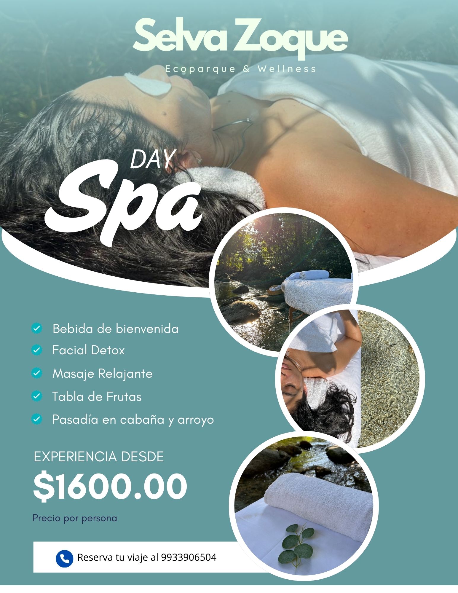 Spa Day80 min$1,600 MXNBebida de bienvenida, facial detox, masaje relajante, tabla de frutas, tiempo para relajarse en cabaña y arroyo.