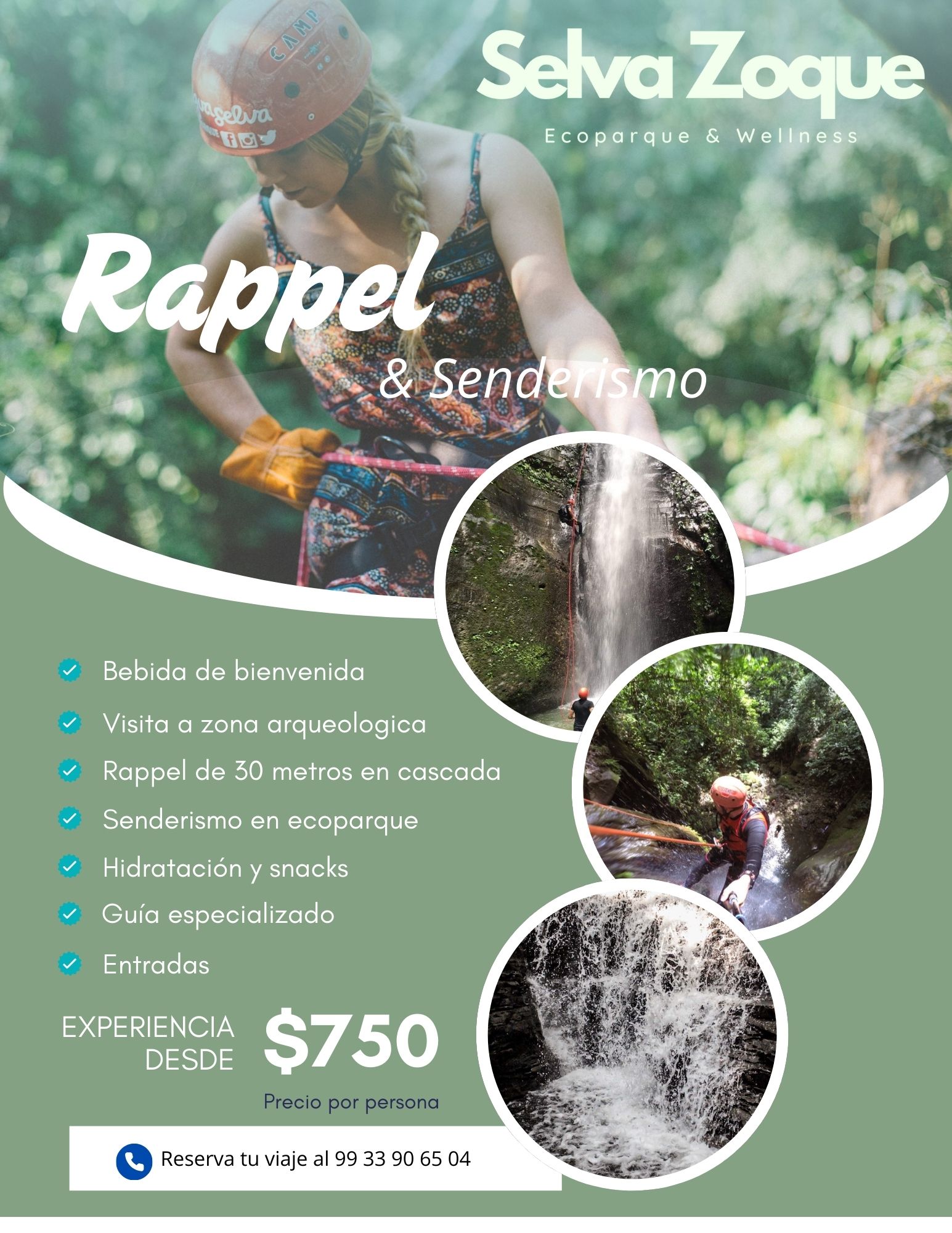 Cañonismo “Zoque”4-6 horas$1,200 MXN (Mínimo 6 personas)Bebida de bienvenida, hidratación, cuotas ejidales, guía local, guía responsable de ruta, snacks, equipo especializado, seguro de actividades al aire libre.