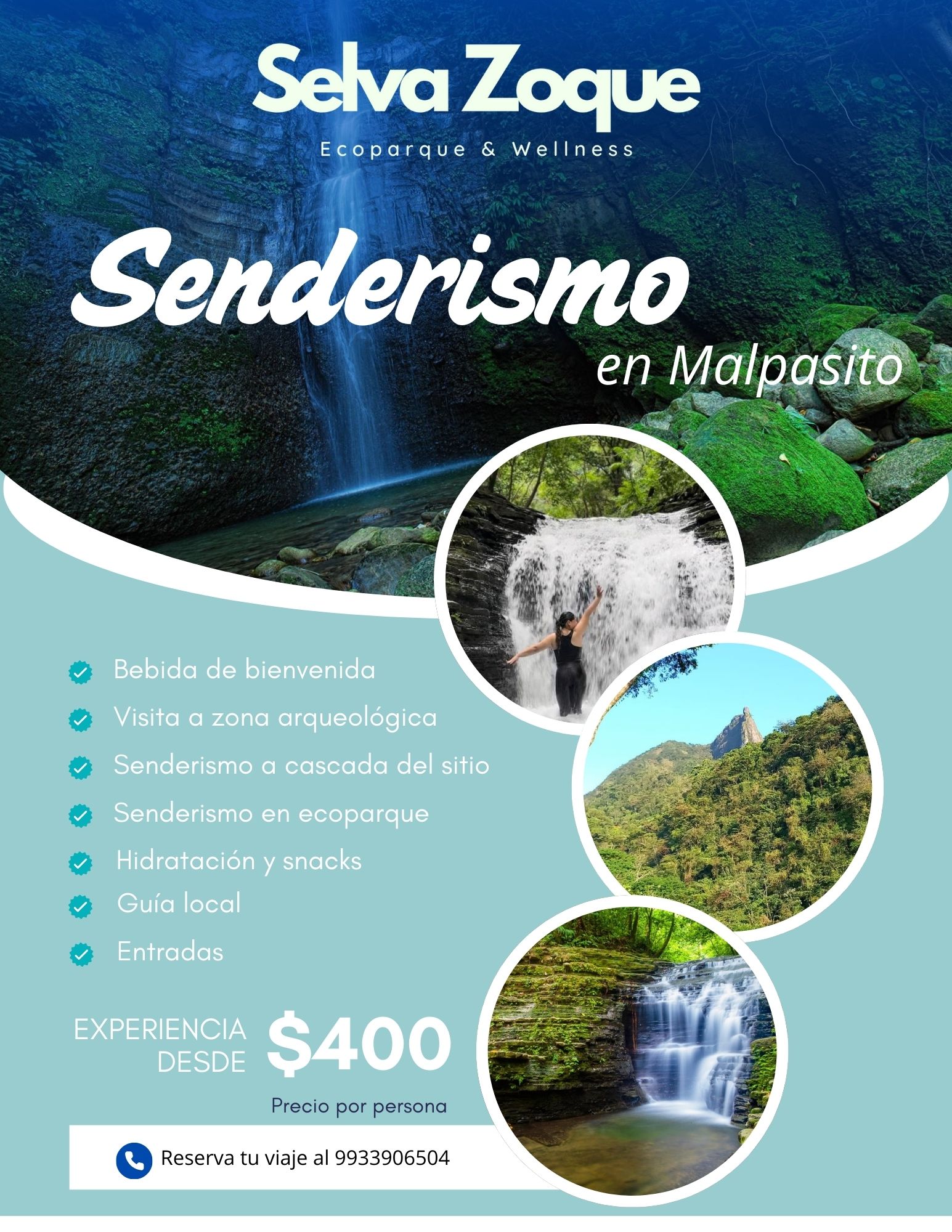 Senderismo en Malpasito2-5 horas$400 MXN (Mínimo 4 personas)Zona arqueológica, visita a cascada del sitio, senderismo en ecoparque, hidratación, snacks, guía.